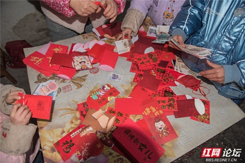 这天,大人们随身都背着几十个红包。红包大小不一,根据亲疏关系来定。自己的亲人,送一两百块;非亲非故的,一般的十块二十块的,也有五十块,最少的是送五块的。